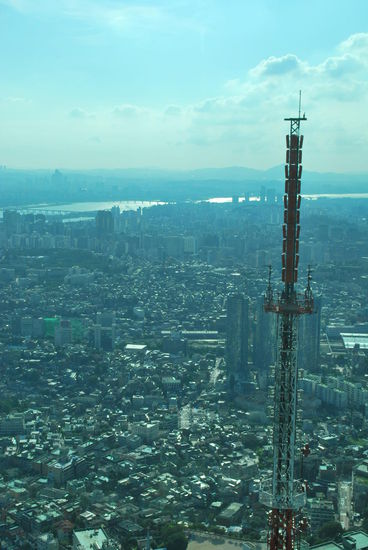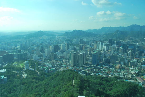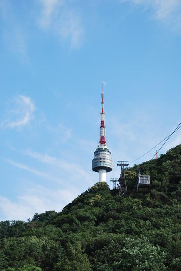 Vom Jongmyo Schrein wäre es nicht weit gewesen zum nächsten Palast, dem Changgyeonggung, Palace of flourishing gladness. Ich überlege, ob ich mir den auch noch reintun soll, entscheide mich aber dagegen. Ich brauche Kontrastprogramm und das kann dann heute nachmittag nur der N Seoul Tower sein. Ich steige an der U-Bahnstation Myeong-Dong aus und erklimme den unteren Teil des Namsan Berges bis zur Talstation der Seilbahn, die zum N Seoul Tower hinaufführt. Man kann zum N Seoul Tower auch hinauflaufen, aber das wäre bei dieser Mörderhitze wahrlich kein Vergnügen. Die 15 Minuten von der U-Bahn bis zur Seilbahnstation waren schon extrem schweisstreibend. Der Turm liegt auf dem 243 m hohen Namsam Berg bzw. Hügel. Der Turm selbst ist dann noch einmal 236 m hoch und bietet einen unbeschreiblichen Blick über die Stadt. Lohnt sich sehr !
