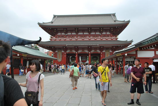 Der Bus fährt unsere kleine Truppe weiter nach Asakusa, wo sich der wichtigste und älteste Tempel Tokios - der Sensoji-Tempel, befindet. Auf dem Tempelgelände befindet sich auch die Nakamise Shopping street, heute ein quirliger Souvenirmarkt. Der Tempel wird auch Asakusa Kannon Tempel genannt, weil sich in der Haupthalle die goldene Statue der Göttin der Gnade - Kannon - befindet. Der japanische Kamerahersteller Canon ist übrigens danach benannt ! Den ausufernden Erklärungen unserer weiblichen Tourguide habe ich im übrigen nicht besonders gut zugehört und mich auch relativ schnell abgesetzt, weil ich lieber alleine unterwegs bin.