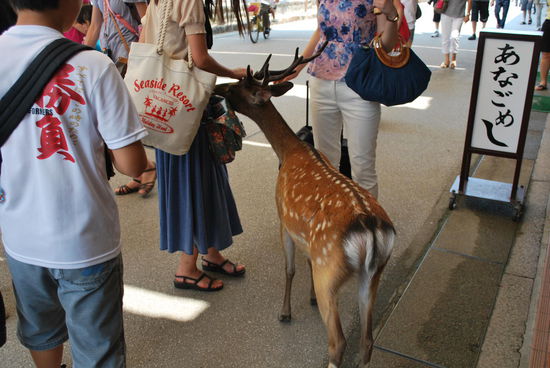 Bin ja heute morgen von Hiroshima ohne Frühstück los, jetzt ist es 13.00 Uhr und ich habe wirklich tierischen Hunger. Westliches scheint es hier nicht zu geben, kein Mc Donald´s, keine Pizzeria, sowieso kaum Restaurants. Wozu auch ? Die allermeisten Besucher kommen nur für wenige Stunden auf die Insel, besichtigen die Tempel und Schreine, nehmen ein paar Souvenirs mit, fotografieren sich mit den Rehen und sind noch vor Einbruch der Dunkelheit wieder verschwunden.