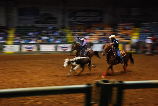 Um 20.00 Uhr hatten wir Tickets für das Championship Rodeo. Wir hatten Plätze schön zuvorderst. Es fing an mit einem Rodeo anschliessend fand ein Barrel Race statt, da werden drei Tonnen in der Halle platziert und es muss um jede Tonne geritten werden, wer die Beste Zeit hat, hat gewonnen. Eine andere Disziplin war das Kälbli fangen und fesseln, der Cowboy musste mit dem Lasso das Kalb am Hals fangen, ab dem Pferd steigen und das Kalb an 3 Beinen fesseln... der schnellste gewinnt. Dann gab es eine Disziplin im Team. Der eine Cowboy musste das Kalb mit dem Lasso an den Hörnern fangen und der andere Cowboy musste es an den Hinterbeinen mit dem Lasso erwischen.