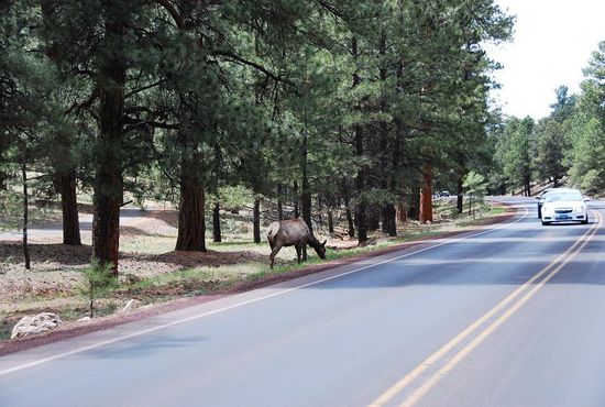 In Grand Canyon Village gibt es drei verschiedene Busrouten, alle machen Stopps an diversen Aussichtspunkten und ist kostenlos. Wir haben uns gut eingepackt, da es sehr windig war und das Wetter auch alle 5 Minuten anders war, wir hatten über Sonne, warm, Regen, nass, Niesel und sogar Schnee. Wir fuhren also von einem Aussichtspunkt zum anderen und sind dann auch zum nächsten Aussichtspunkt spaziert. Wir sahen viele Eichhörnchen und auch Elche, die haben sich kaum stören lassen. Spät abends fuhren wir noch ein Stück und übernachteten auf einem Truck PP.