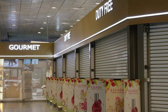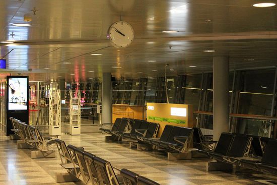 Wir wandern durch den völlig verwaisten Flughafen auf der Suche nach unserem Gate.