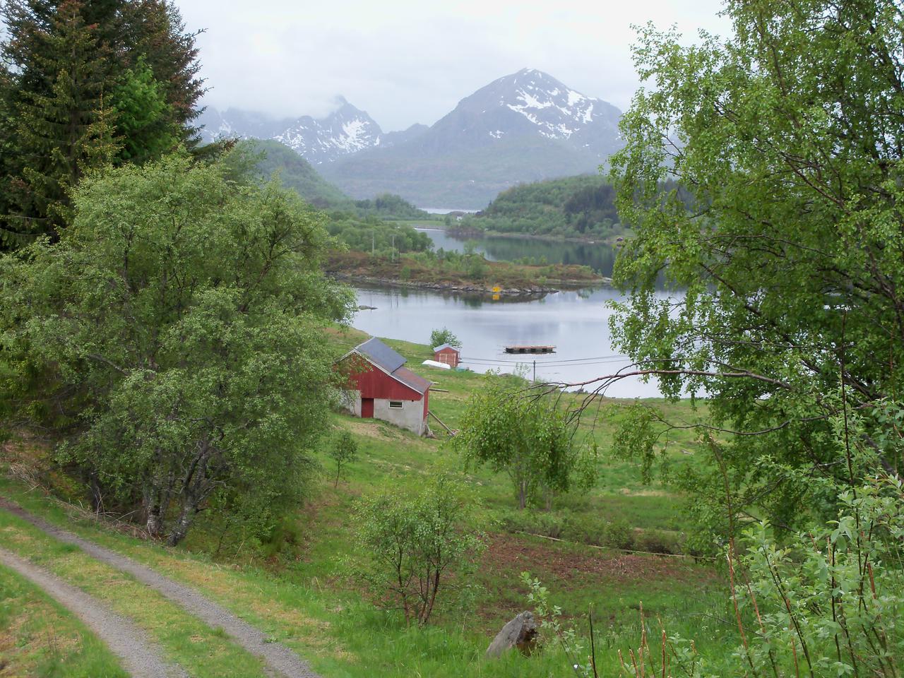 Wir fahren über die Brücke nach Aarstein und die "Piste" an der Ostseite der Insel entlang, immer mit Blicken auf den Vestfjord, die Festlandsberge dahinter am Horizont und viele kleine Inselchen im Wasser. Für Sonntag Vormittag und weit abseits aller Hauptrouten kommen uns tatsächlich drei Autos und ein WoMo entgegen. Voraus kommt der Trollskarholmen mit seinem Doppelstrand in den Blick.