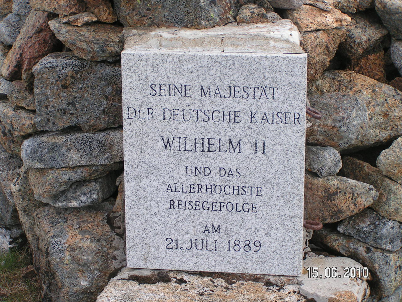 Auf dem Bergplateau ist viel Platz zum Laufen, Schauen und sich Hinsetzen. Hier stehen die zwei Steinhäufchen mit Tafeln zur Erinnerung an die Kaiserbesuche. Zu bewundern sind die geschliffenen runden Felsen mit Spalten oder mit Moosbewuchs und Pfützenmulden. Lange genießen wir diesen Ort, fotografieren immer wieder, essen etwas, freuen uns gemeinsam oder besinnlich jeder für sich. Erst nach zwei Stunden treiben uns der kühler werdende Wind und die heranziehenden dunklen Wolken von Westen wieder runter. Der Abstieg ist problemlos, allerdings fängt es auf halber Strecke dann doch an zu regnen. Gerade in diesem Moment begegnet uns ein Paar welches recht sommerlich gekleidet den Aufstieg begonnen hat.