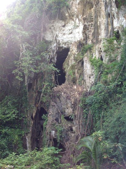 Diese Fahrt auf dem Fluss ist wirklich toll. Getragen von der Strömung erleben wir Sightseeing mal ganz anders. Das Panorama, das uns hier geboten wird ist einzigartig und beeindruckend. Gemütlich schippernd geht es an den zum Teil direkt am Ufer steil aufragenden Felsen durch den Dschungel. Die Vegetation ist üppig und an manchen Stellen wachsen die Bäume bis zur Mitte des Flusses und lassen ihre Lianen ins Wasser hängen. Auf ihnen schlafen die Wasserschlangen, die erst abends auf die Jagd gehen. Wir sehen zwei davon über unseren Köpfen auf den Ästen liegen. Ab und zu muss man mit den Händen kräftig paddeln, um auf Kurs zu bleiben. Immer wieder geht es auch durch Stromschnellen, die völlig harmlos sind, uns aber mit ihren kleinen Wellen beschleunigen. Es ist erstaunlich, wie gut der Hund mithält.