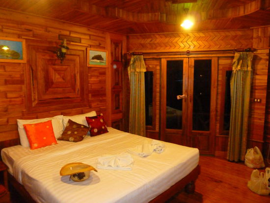 Abseits vom Hauptstrand und dem ganzen Trubel gelegen finden wir ein kleines Resort mit schönen Holzbungalows zu einem guten Preis. Endlich angekommen! Das war bisher der längste Fahrtag in Thailand und wir sind froh, dass die Odyssee ein Ende hat. Wir haben uns auch für Krabi entschieden, weil wir hier noch einiges unternehmen können, das uns durch den Hundebiss entgangen ist. Leider haben wir keinen Tisch, den wir zum Spielen brauchen, also bastelt uns Thomas schnell einen, indem wir einen der leer geräumten Hartschalenkoffer auf den Hocker stellen.