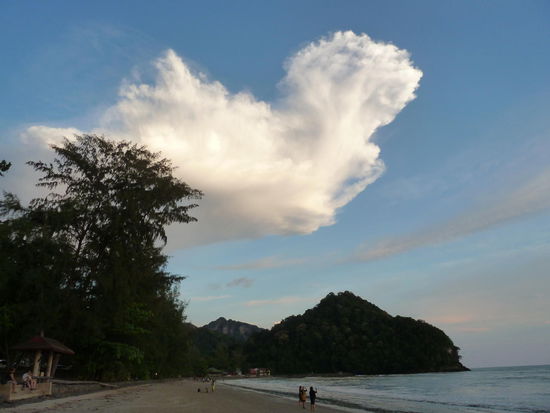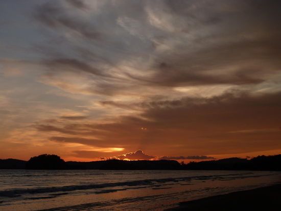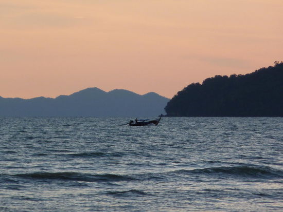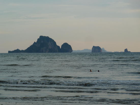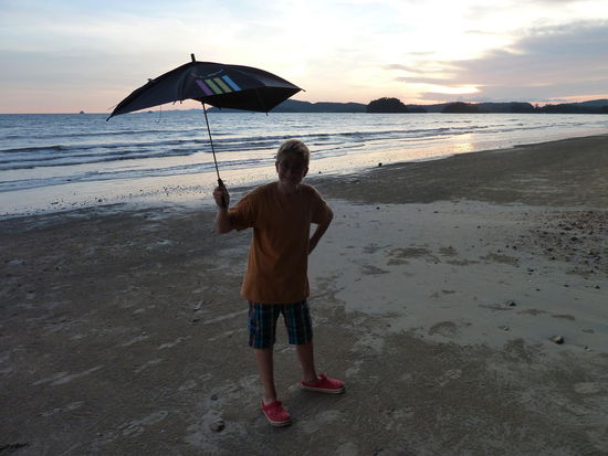 Heute ist leider unser letzter ganzer Tag in Thailand. Morgen fliegen wir zurück. Bis um sechs verbringen wir den Tag mit frühstücken, Pool, Massage, spielen und nochmal Pool. Am Abend verspricht der Himmel endlich mal einen Sonnenuntergang, also fahren wir runter zum Strand. Die Sonne geht zwar hinter den Felsen unter und nicht über dem Meer, es sieht aber trotzdem schön aus.