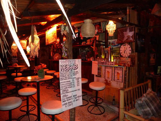 Wir fahren Thailändisch mit dem Pickup, das heißt die Männer vorn und Frauen und Kinder hinten auf der Ladefläche. Frank hat zwei Töchter im Alter von fünf und elf Jahren. Wir kommen zu Poppy's Kebab Cafe, etwas abseits gelegen und wohl ein Insider-Treff. Hier kennen sich fast alle. Dort essen wir eine ganz besondere Spezialität, nämlich Krokodil-Kebab. Schmeckt super! Während die Kinder sich beim Minigolf vergnügen, gesellen sich zwei Freunde von Frank zu uns, die gerade bei ihm den Bamboo Room restaurieren und die wir auch schon kennen. Es wird eine lustige Runde, bis wir gegen neun gehen müssen, denn die Mädels haben morgen Schule. Das gleiche Spiel auf dem Pickup wieder zurück. Thomas reicht das dann auch für heute.