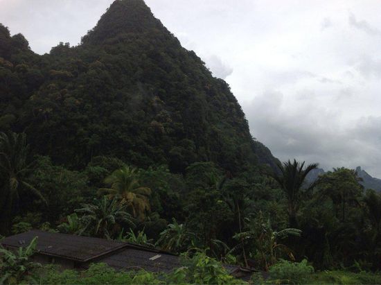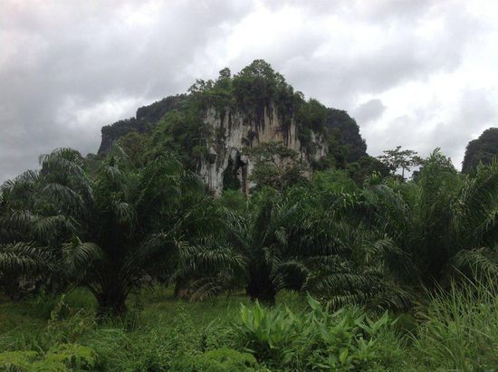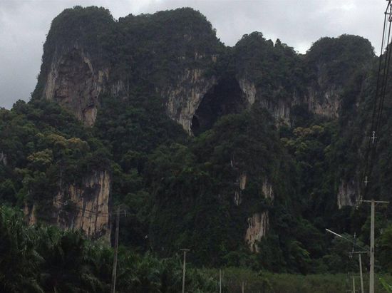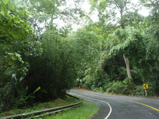 Gegen zwölf checken wir aus und fahren direkt ohne Frühstück los. Wir hoffen, dass wir unterwegs was leckeres auftreiben. Hinter Krabi-Stadt ist die Gegend ziemlich dünn besiedelt. Es dauert ewig, bis wir mal wieder in eine Stadt kommen. Dort decken wir uns mit Spießchen und dicken Waffeln ein. Immer wieder sehen wir die dicht bewachsenen Kalksandsteinfelsen, die vereinzelt oder in Gruppen in die Höhe ragen. Da sich der Himmel dunkel zugezogen hat, fängt es auch bald an zu regnen und zwar richtig ordentlich, wie es sich für einen Monsunregen gehört. Dann fahren wir durch einen dschungelartig bewachsenen Nationalpark, in dem die Bäume bis über die Straße wachsen. Die Geräuschkulisse wird immer lauter, je weiter wir in das Gebiet vordringen. Später schraubt sich die Straße serpentinenartig in die Höhe. Durch die hohe Luftfeuchtigkeit nach dem Regen, fängt es an, aus der Klimaanlage zu dampfen.