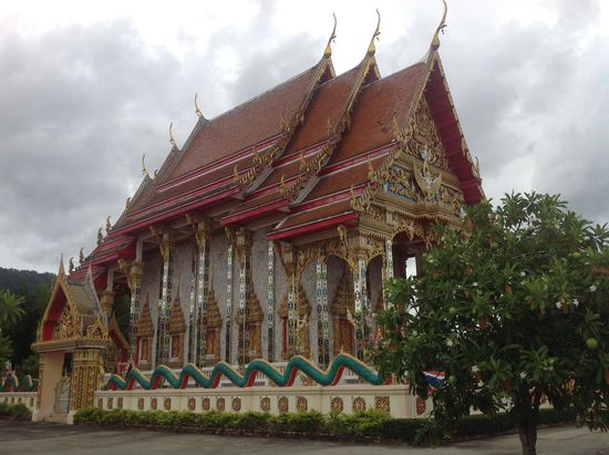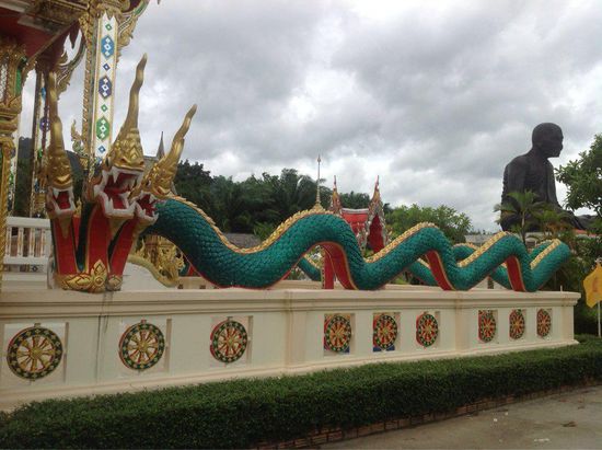 Jetzt wird das Panorama richtig schön, denn über den Bergen und Felsen haben sich vereinzelte Wolkenfetzen festgesetzt und der Blick ins Tal erstrahlt ungestört von jeglicher Zivilisation in sattem Grün. Leider geht es bald schon wieder bergab und die felsige Landschaft wird von der typischen tropischen Vegetation Thailands abgelöst. Bei einem prachtvollen Tempel, der mit den Farben Gold, Blau und Rot ausgeschmückt wurde, machen wir einen kurzen Stop. Hier sitzt auch eine riesige Statue des Mönchs, den wir bereits in Phuket gesehen haben. Um das Hauptgebäude herum schlängelt sich ein grüner Drache mit je drei Köpfen rechts und links neben der Treppe. Die Anlage ist so groß, dass ich vermute, dass es sich dabei auch um ein Kloster handelt. Bei den gläubigen Buddhisten sollte jeder Mann einmal in seinem Leben einen Aufenthalt in einem Kloster absolviert haben.