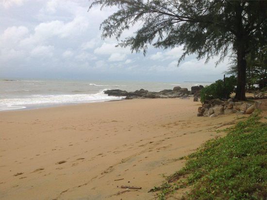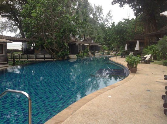Nach insgesamt drei Stunden erreichen wir endlich unser Hotel. Die ganze Fahrt war sehr angenehm, die Straßen sind in gutem Zustand und es herrscht nur wenig Verkehr. Im Khao Lak Resort lassen wir uns, wie wir es bereits in Indien praktiziert hatten, zuerst die Zimmer zeigen und entscheiden uns dann für den Beachfront Bungalow, ungefähr zehn Meter vom Strand entfernt. Schöööööön! Vom Balkon aus blickt man direkt aufs Meer und den makellosen Strand, auf dem vereinzelte abgerundete Felsbrocken liegen. An einer Stelle kann man auch schwimmen gehen, obwohl wegen der Regenzeit das Meer sehr wild ist und die roten Fahnen anzeigen, dass gefahrloses Baden eigentlich nicht möglich ist. Hinter den Strandbungalows liegen mehrere lang gezogene Pools mit glasklarem kaum gechlorten Wasser. Hier schwimmen und entspannen wir. Der Himmel ist bedeckt aber dadurch ist es nicht so heiß und Sonnencreme überflüssig.
