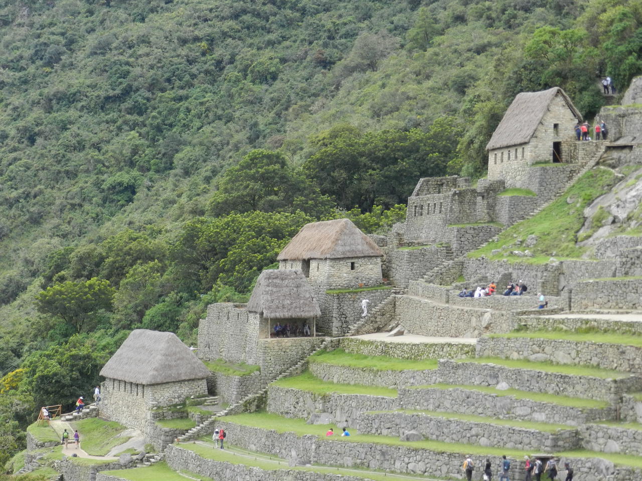 Einmal oben angekommen (oben heißt - gemessen am Hauptplatz Machu Picchus 2.354 m hoch), müssen die Massen, die bereits am frühen Morgen ankommen, durch eine Eingangskontrolle. Nicht nur die Eintrittskarten werden kontrolliert, auch der Pass muss vorgezeigt und Gepäck abgegeben werden. Dann einige Schritte und schon hat man den ersten Blick auf die gesamte Anlage - wenn denn der Nebel bzw. die Wolken hoch genug stehen. Aus dicken Felsbrocken sind die Häuser, Lagerhäuser, Tempel und Plätze und Wege erbaut, alles in grauem Fels, ein schönes Bild, welches sich dort gegen die grünen Berge abhebt.