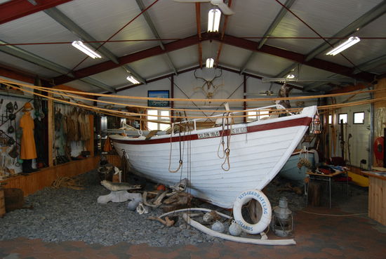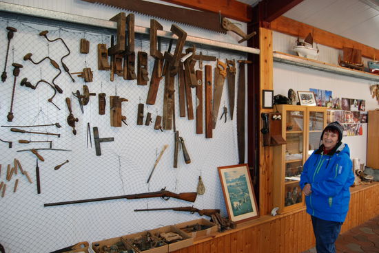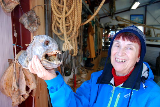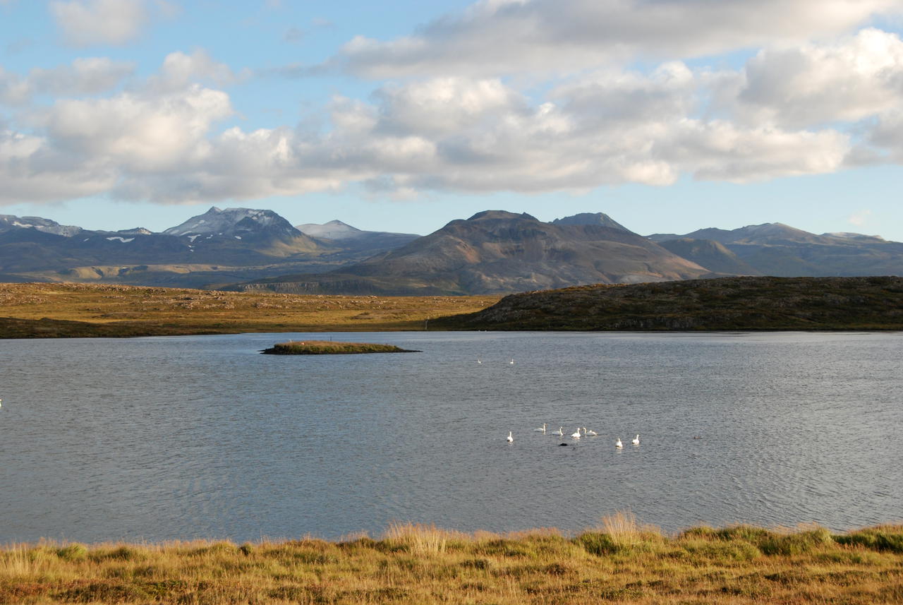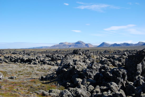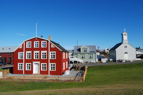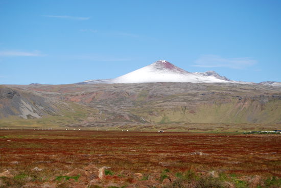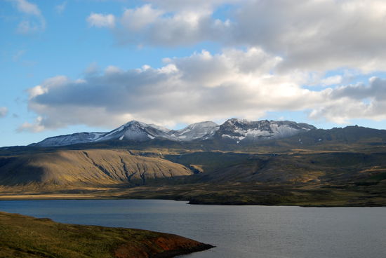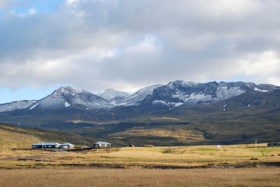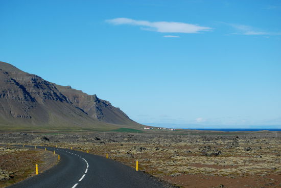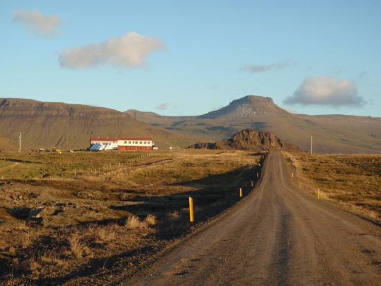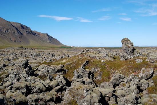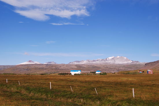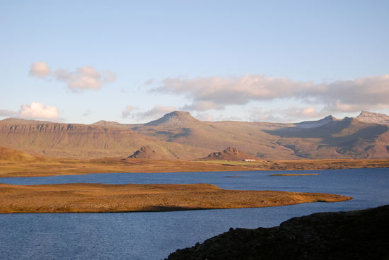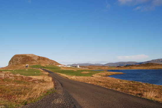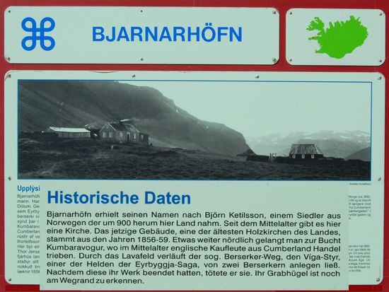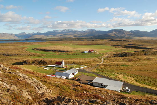 Über Borgarnes ging es an der Eldborg vorbei übers Gebirge zur Nordseite der Halbinsel Snæfallsnes. Durch die Berserkjahraun fahren wir nach Bjarnarhöfn. Wir hatten gelesen, daß hier Grönlandhai verarbeitet wird. Normalerweise kann man Haifleisch nicht essen, da Haie keine Nieren haben und so Harnstoff und Ammoniak anreichern. Wenn man das Fleisch aber über mehrere Monate entsprechend lagert und somit fermentiert, kann man es essen....sagen jedenfalls die Isländer und nennen es Hákarl. Hier gibt es auch ein kleines Museum, in dem so ungefähr alles gezeigt wird, was es in dieser Gegend gibt oder gab. Hier steht auch eine kleine alte Kirche, die aber abgeschlossen war.