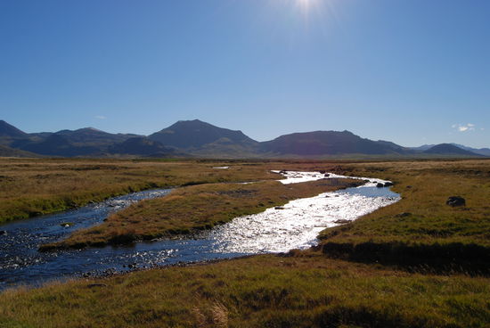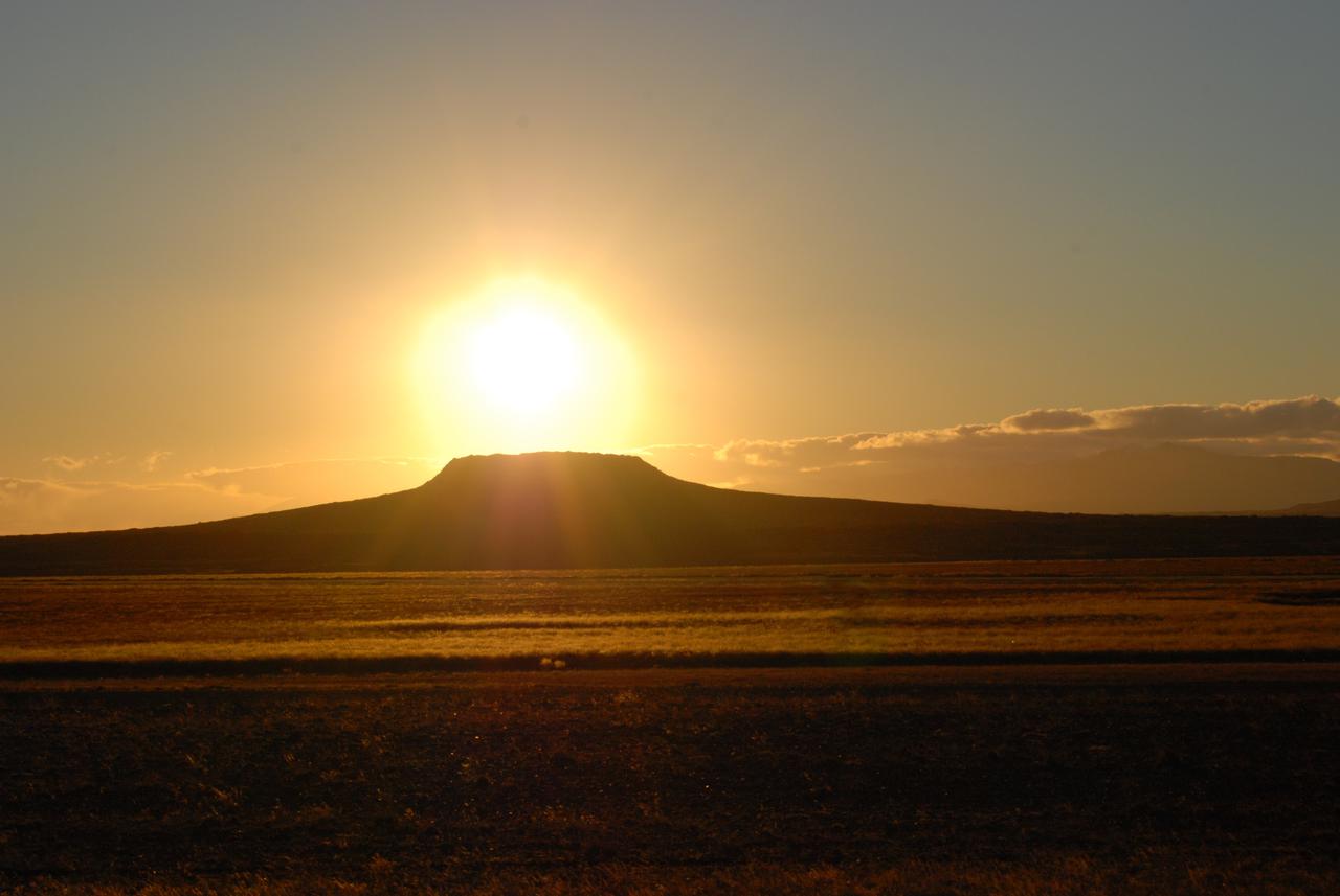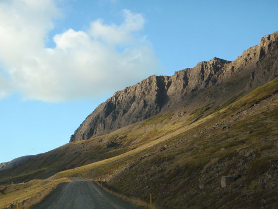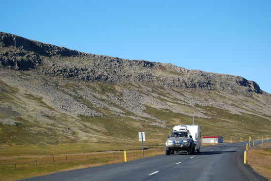 Dann ging es weiter über Schofferpisten am Ufer des Hvammsfjörður entlang. Immer wieder gab es herrliche Ausblicke sowohl aufs Meer und viele kleine Inseln als auch auf die Berge. Richtung Süden bogen wir auf die 55 ab, und als wir über den Berg kamen, sahen wir in der Ferne die Eldborg liegen. Die Berge sahen toll aus im Licht der untergehenden Sonne. Nun wissen wir auch, wo sie verschwindet, Christa gelang ein tolles Foto, wie die Sonne in die Eldborg fällt.
