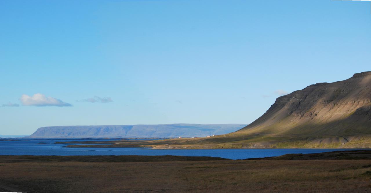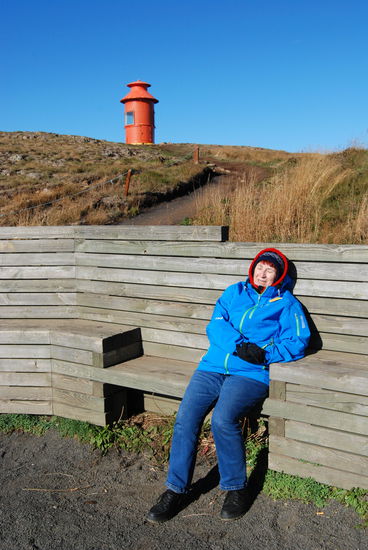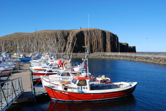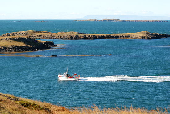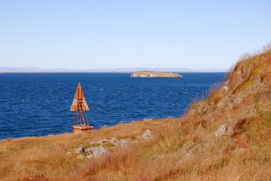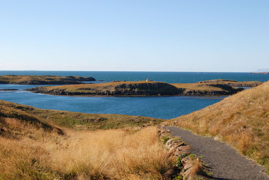 Weiter ging es über die Nebenstrecke nach Stykkishólmur. Das ist ein wirklich hübscher kleiner Ort. Wir fuhren direkt zum Hafen. Vor diesem liegt ein großer Felsen aus Basaltblöcken, der den Hafen perfekt zum Meer abschirmt. Einen besseren Schutz kann es nicht geben. Oben auf dem Felsen, den wir bestiegen, steht ein kleiner Leuchtturm. Von dort hatten wir eine tolle Aussicht über den Breiðarfjörður bis hin zu den Westfjorden, aber auch über die ganze Stadt. Dabei fallen das große Krankenhaus, die sehr moderne weiße Kirche und einige alte ungewöhnliche Häuser auf.