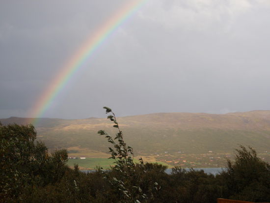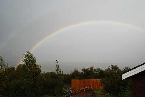 Das Wetter zog sich langsam zu. Nun endlich wollten wir uns die nahe Umgebung ansehen. Wir gingen die Wege hinter dem Haus in das Ferienhausgelände. Ab und zu fing es an zu tröpfeln, und die ersten Regenbögen zeigten sich wieder.