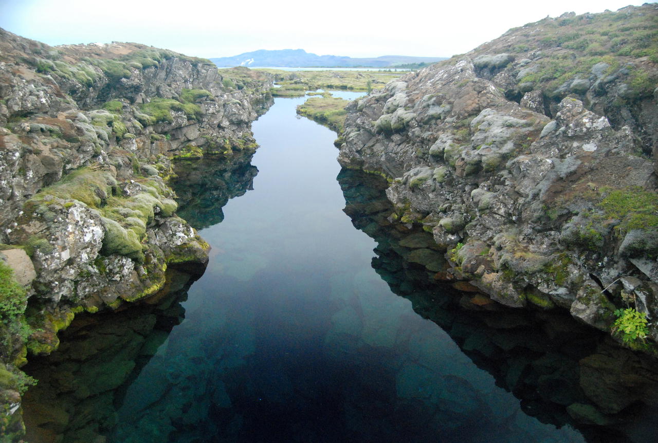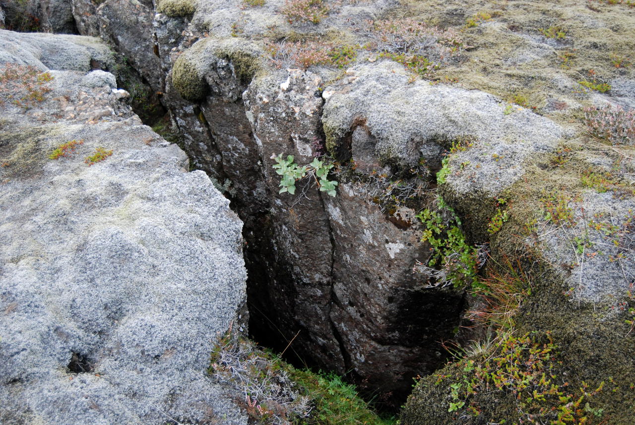 Anschließend gingen wir zu dem Wasserfall des zur Wasserversorgung des Versammlungsplatzes umgeleiteten Flusses Öxará. Dann machten wir einen Abstecher zu den Ausläufern des Þingvallavatn, offensichtlich Bruchschluchten, die mit dem See in Verbindung stehen. Landeinwärts gab es viele Spalten, die durch die auseinanderdriftenden Kontinentalplatten entstanden sind. Cora und Steffi nutzten die Gelegenheit, sich von Europa nach Amerika die Hand zu reichen.
