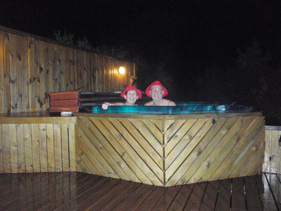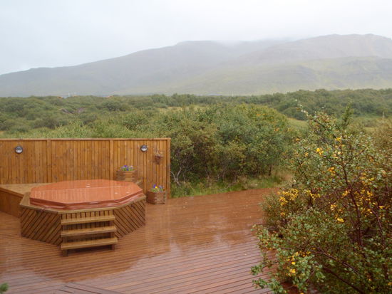 Um den Hvalfjörður herum und über die Berge ging es zurück nach Hause in den heißen Pott. Wir hatten festgestellt, daß es bei jedem Wetter schön darin ist. Nur wenn es regnete, war es unangenehm am Kopf. So setzten wir unsere Südwester auf, das sah lustig aus!