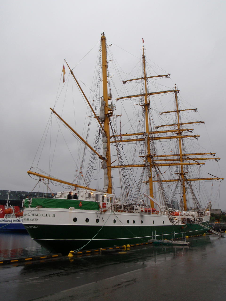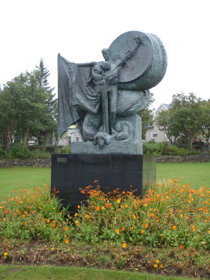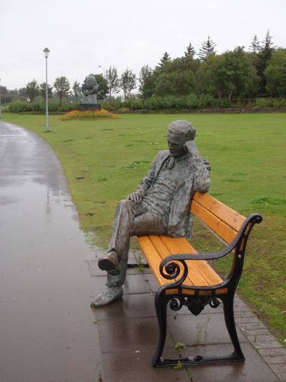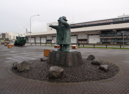 Auf dem Rückweg fuhren wir am Tjörnin vorbei. Im Park gab es eine ganze Menge unterschiedliche Skulpturen. Da der Regionalflugplatz mitten in der Stadt liegt, sieht man immer wieder einfliegende Maschinen. Anschließend machten wir am Hafen Halt. Dort lag die "Alexander von Humboldt". Wir hatten noch mitgenommene Brote, die wir hier verzehrten, denn im Museum hatten wir nur kurz einen Kaffee getrunken. Der Regen ließ nun etwas nach, so konnten wir noch ein paar Bilder machen. Auf dem Weg zum Einkaufszentrum "Kringlan", wo allerdings die meisten Geschäfte schon geschlossen hatten, stoppten wir noch an der modernen Skulptur des Wikingerschiffes von Jón Gunnar Árnason von 1986.
