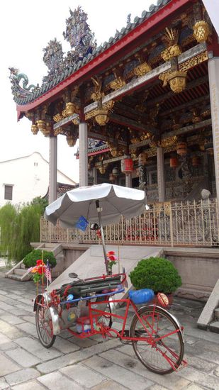 Cheah Kongsi mit Trishaw im Vordergrund - der Cheah Clan ist einer der ältesten Hokkien-Clans in Penang. Tempel wurde um 1870 fertig gestellt