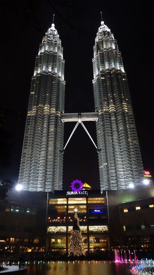 Aber das Wichtigste waren natürlich die Petronas-Towers mit ihren 452m Höhe, die schon beeindruckend aussehen. Bis zum Jahre 2004 waren sie die höchsten Türme der Welt. Die Fassaden bestehen aus 83.500 m2 rostfreiem Stahl und 77.000m2 Glas, das in den 32.000 Fenstern der Türme verbaut wurde. Die Towers gehören zu den sichersten Hochhäusern der Welt, die je gebaut wurden.