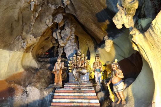 Erst 1879 wurden diese Höhlen in den steil aufragenden Kalksteinfelsen bekannt und seit 1892 sind sie eine Kultstätte für die malaysischen Hindus. Am Fusse der 272 nach oben führenden Stufen steht eine über 40m hohe goldene Statue von Lord Murugan, ab da heisst es Treppe steigen. Gefühlte 500 Stufen höher, mit leicht zitternden Beinen, war ich aber erst am Höhleneingang. Da geht es dann wieder Stufen hinunter und wieder hoch, bis man das Höhlenende erreicht hat. Allein die Grösse der Höhle ist beeindruckend, trotz der kleinen Gebetsnischen und des Tempels am Ende wirkt sie jedoch recht schmucklos. Im Januar/Februar findet das grösste Hindufest ausserhalb Indiens hier statt, und über eine Million Gläubiger pilgern anl. des Thaipusam-Festes hierher. Aber der Ausflug hat sich trotzdem gelohnt, trotz des vergossenen Schweisses. Die Makaken, die sich üblicherweise hier aufhalten und teilweise recht aggressiv gegenüber Besuchern sein sollen, haben wir nicht gesehen. Unser Taxifahrer erzählte uns, dass sie normalerweise in den Morgenstunden auftauchen und auf Nahrung warten.