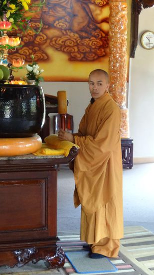 Direkt neben unserer Unterkunft ist ein buddhistischer Tempel, der "Chua Ky Vien", den hatten wir die ganzen Tage schon von unserem Zimmer aus gesehen, sind aber erst heute dazu gekommen, ihn mal zu besichtigen. Der Buddha vor dem Eingang wird von der neunköpfigen "Naga" beschützt. Innen waren einige Gläubige und haben gebetet.
