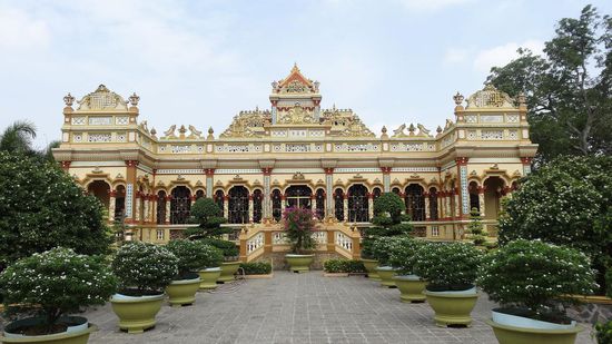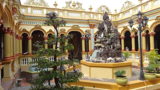 Am nächsten Tag sind wir durch schmale Gassen und Wege zum "Vinh Trang Tempel" gelaufen, in knapp einer halben Stunde waren wir da. Er gilt als ältester Tempel des Mekong Deltas und wirkt wie ein Palastbau. Unterwegs wird man überall gegrüßt und es wird gewunken - die Menschen sind unglaublich freundlich, freuen sich, wenn man sie fotografieren möchte.