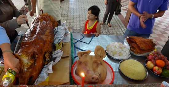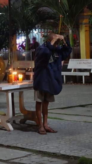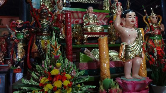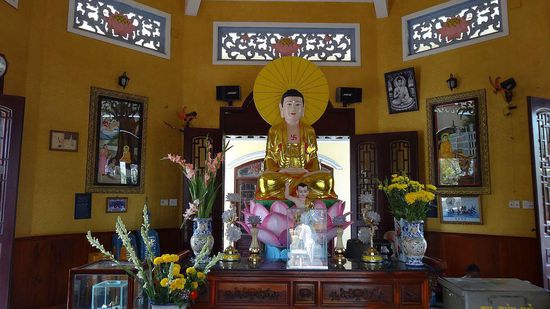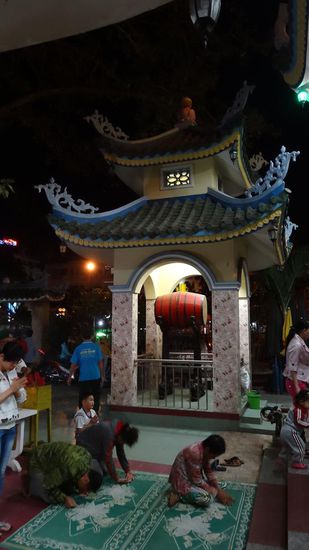 Drei andere wichtige Tempel standen auf dem Programm, der erste war der "Tay An" Tempel, eine Mischung aus buddistischem und hinduistischem Bauwerk. Der zweite, der Ladytempel, "Chúa Xu". Von außen nicht sehr ansprechend, ein recht modernes Bauwerk inmitten der Stadt. Abends durch viele kleine Lämpchen illuminiert, da wirkt er viel schöner, aber wir waren am Tag da, alles geht halt nicht. Innen Fotoverbot, aus etwas Entfernung ist mir doch das ein oder andere Foto gelungen. Wieder lagen viele Opfergaben auf einem Tisch bereit. Diem erklärte uns aber, dass diese nach Abbrennen der Räucherstäbchen von ihren Überbringern wieder mitgenommen werden.