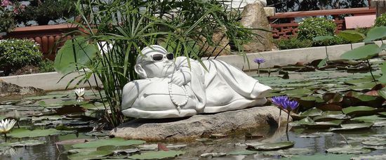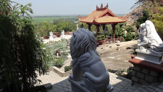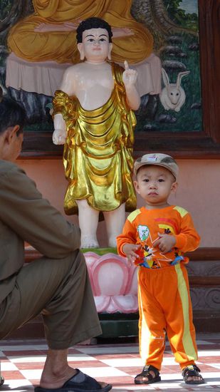 Im Außenbereich das erste Mal einen mächtigen Kanonenkugelbaum (Couroupita guianensis) gesehen. Bis die Blüte sich öffnet, vergeht fast ein Jahr. Der letzte Tempel war, wie sogar der vietnamesische Name besagt, "Chùa Hang", an einen Berghang gebaut. Nach vielen Stufen ist man oben. Sehr schön in Terrassen angelegt, mit Teich und vielen, teilweise recht lustigen Figuren. Von oben eine wunderbare Fernsicht über die Reisfelder.