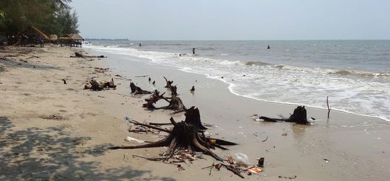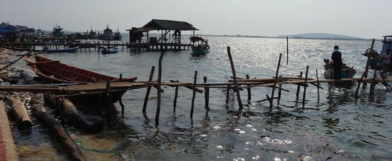 Zum zweiten Halt mussten wir zunächst die 1,8 km lange Mautbrücke überqueren. Auf teilweise unbefestigter Straße erreichten wir schließlich Koh Kong Beach, einen lang gezogenen schmalen weißen Sandstrand. Am Wochenende von Einheimischen besucht, waren wir und ein anderes Paar an diesem Wochentag die einzigen Besucher. Außer ein paar einfachen aus Brettern gezimmerten Restaurants, die von den Betreibern mit ihren Familien bewohnt werden, sowie ein paar Sitzgelegenheiten und Liegestühlen gibt es dort nichts. Das Wasser ist sauber, nur der Strand könnte mal vom ganzen angespülten Unrat befreit werden.