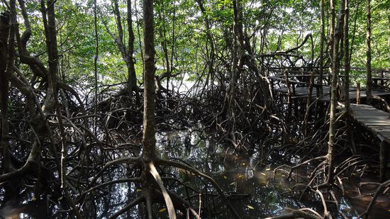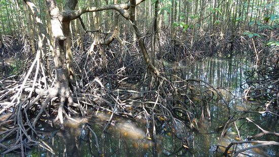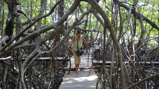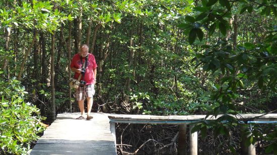 Zuerst sind wir zum größten Mangrovengebiet Südostasiens, dem "Peam Krasaop Nationalpark", der einige km südlich der Stadt beginnt, gefahren. Eintritt kostet für Foreigners 5000 Riel (1,25$), dann kann man ein gutes Stück recht bequem auf den angelegten Beton- und Holzstegen ablaufen, um einen wenigstens kleinen Eindruck von diesem riesigen Mangrovenwald mit seinen hohen Bäumen zu bekommen.