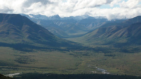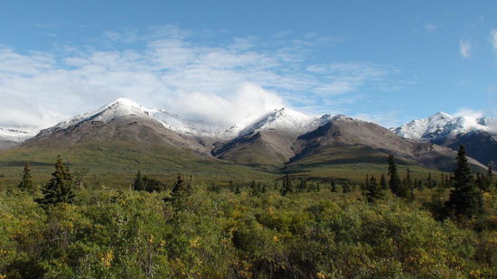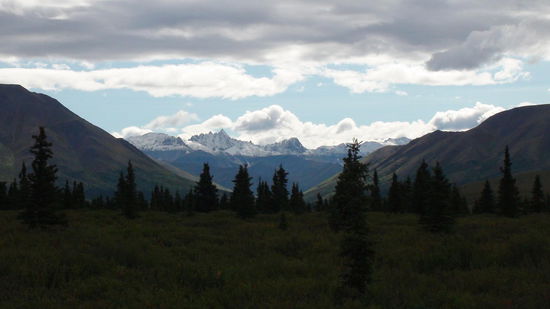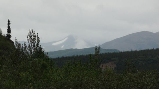Der Wanderweg bietet uns die Gelegenheit zahlreiche schneebedeckte Berge zu entdecken und zu bestaunen, aber der Mount McKinley bleibt für uns leider verborgen.
