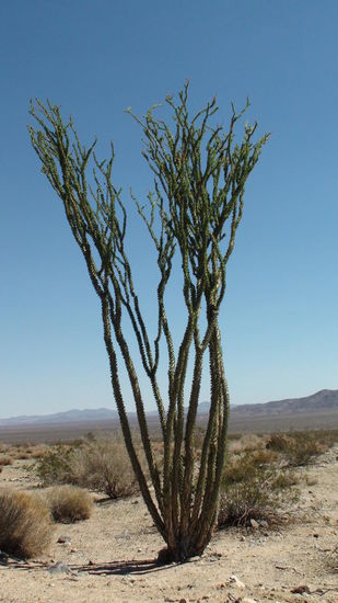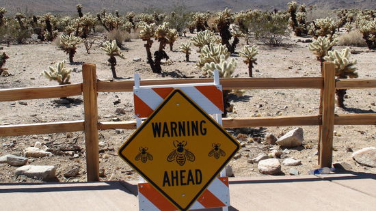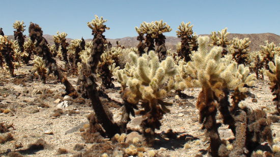 Im Garten wachen die gefürchteten Jumping Cholla Sie heißt so, weil sie bei der kleinsten Berührung ganze Stachelbüschel absprengen kann. Der vorbeigehende Wanderer ist also gut beraten, sich den Pflanzen nicht zu dicht zu nähern, denn die Stachel lassen sich nur schmerzhaft entfernen.