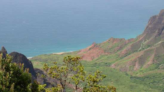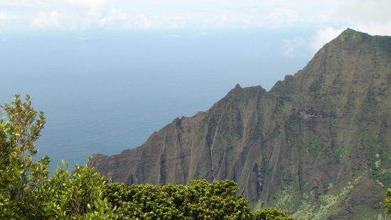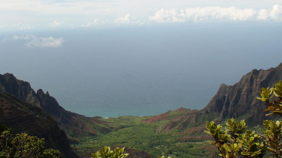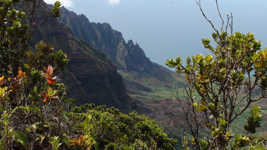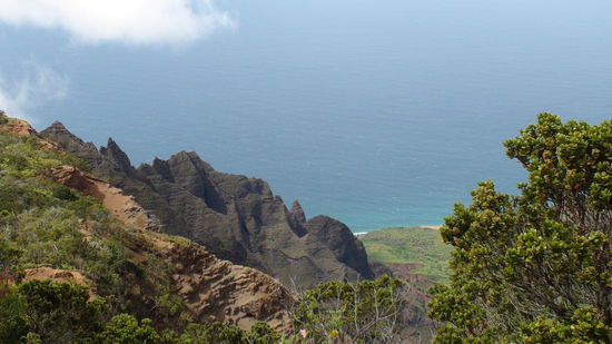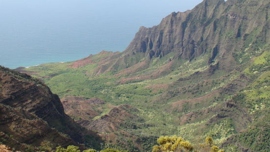 Sowohl der Kalalau Lookout als auch der Puu O Kila Lookout bieten eindrucksvolle Aussichten auf das Kalalau Valley, die bis zum Meer reichen. Von hier aus können wir auch einen kleinen Teil der hohen Klippen der Napali Coast sehen.