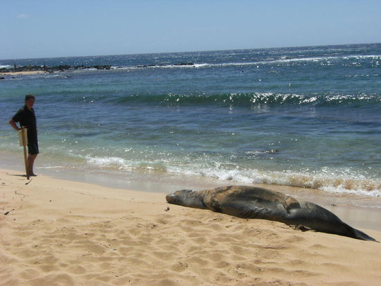 Eine vom Aussterben bedrohte Hawaii Mönchsrobbe. Die Gesamtpopulation wird auf 600 Tiere geschätzt. Sie erholt sich direkt neben uns am Strand von den Gefahren des Meeres. Die Felloberseite ist silbergrau.