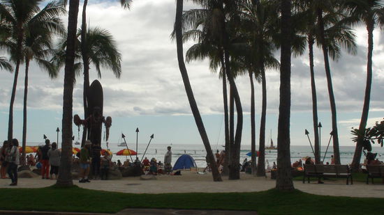 Statue des Duke Kahanamoku mit Leis geschmückt. Der Duke gilt als Begründer des modernen Wellenreitens, in den 20er Jahren war er mehrfacher Olympiasieger im Schwimmen