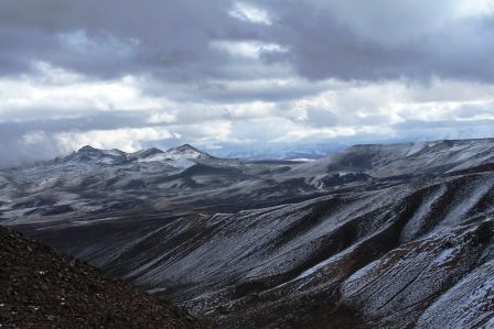 Auf unserer Strecke begleitet uns schon seit Puno ein Schienenstrang. Es ist die Verbindung Puno - Arequipa, auf dem nur Güterzüge fahren. Auch begegnen uns viele schwer beladene Camione. Sie bringen schwere Maschinen und Geräte in die Minen, von denen es hier in den hohen Anden sehr viele gibt. Noch immer wird Gold, Silber und andere Bodenschätze abgebaut. Weit in der Ferne grüsst der Vulkan von Arequipa, der Misti. Er wird heute seinem Namen gerecht: der in weiss gehüllte. Nicht nur auf dem Vulkan liegt Schnee, die ganze Gegend ist frisch überzuckert und bietet einen ungewohnten Anblick.
