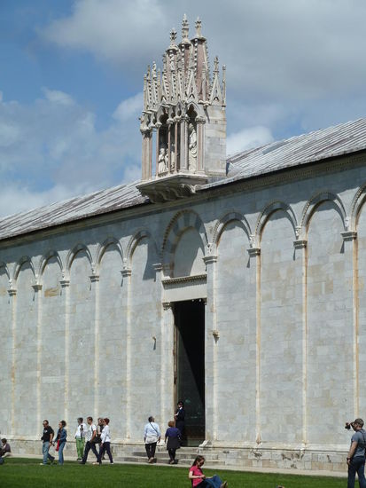 Das Areal mit dem schiefen Turm ist mittlerweile wie fast die gesamte Innenstadt praktisch Fußgängerzone und nur für Anlieger befahrbar. Nur entlang des Arnos kann man durch und über ein paar Ringstraßen um die Stadt herumfahren. Wir machen zunächst ein paar Fotos und kaufen sodann ein sog. Kombiticket (gut hierbei ist: man kann wählen: Turm 18€ mit Zeitvorgabe, 1Ziel 5€, 2 7, 3 8 und 4 Ziele 9€ jeweils mit Dom, aber ohne Turm) Wir wählen das Ticket zu 8 € und dürfen Dom, Baptistierium, Camposanto und das Museo del Opera del Duomo besichtigen.