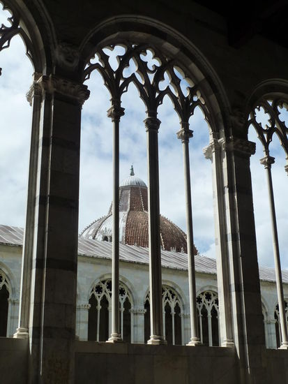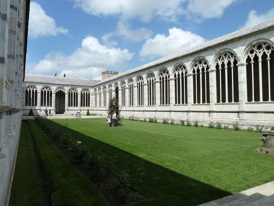 Wir beginnen die Besichtigung, nachdem Ulrike ca. 15 min für einen Toilettengang Schlange gestanden hat, im Monumentalfriedhof Camposanto, einem langen rechteckigen Kreuzgang mit romanischen Bögen, die später mit Kreuzrippen ausgefüllt wurden. Die vorhandenen Fresken wurden in einer speziellen Technik (Niellotechnik) von der Wand genommen, restauriert und wieder aufgehängt. Beeindruckende Sarkophage und Grabstätten reicher Bürger Pisas stehen dort in den Gängen. Auch hier herrscht noch Ruhe.