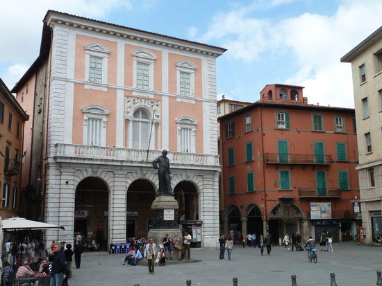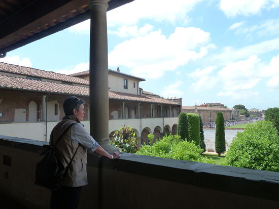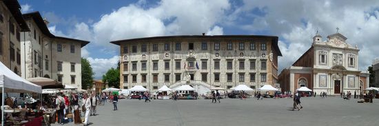 Nach dem Museumsbesuch (hier war eine Toilette ohne jeden Andrang) laufen wir ein wenig nach Osten und finden auf der Piazza del Cavalieri ein wunderschönes Gebäueensemble und zudem einen Antikmarkt, auf dem Ulrike doch tatsächlich ihre Kette mit blauen Steinen findet, die sie im Urlaub suchen wollte.