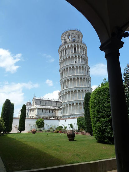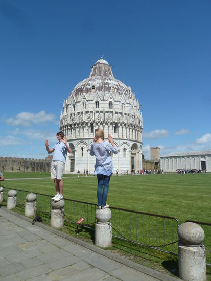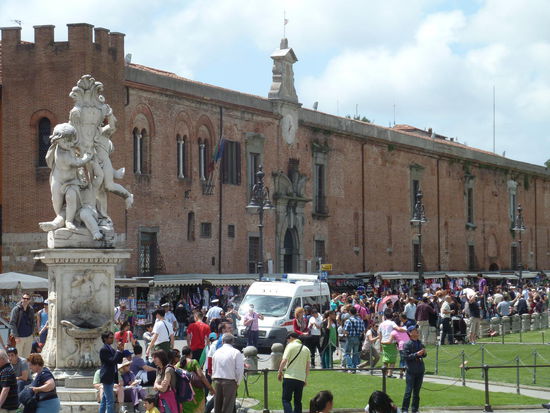 An der alten Zitadelle bietet sich ein tolles Panorama von der Autobrücke und entlang der Kaimauer kann man schon die alten Arsenale bewundern. An der Brücke angekommen, wenden wir uns nach Norden und laufen schnurstracks zur Piazza del miracoli. Langsam wird es voller, Bimbos verkaufen alles Mögliche, eine südamerikanische Frau bettelt aggressiv mit ihren drei Kindern - sie bekommt von mir eine auf ihre Pfote getackert, da alle vier uns anzugrabschen.