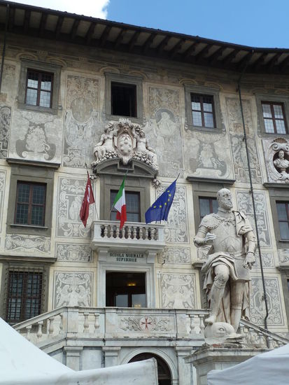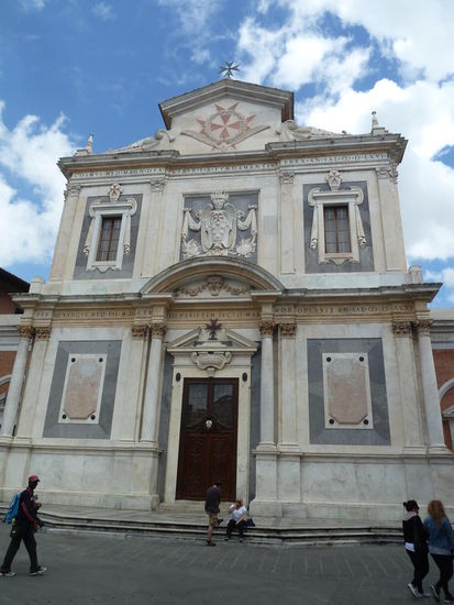 Rechts des Palazzos dei Cavalieri liegt die Kirche Santo Stefano dei Cavalieri - auch hier zeichnete Vasari 1565-69 verantwortlich für den bau. Wir drehen einige Runden auf dem Markt, laufen wegen der Uhrzeit (jetzt ist die Domfassade sonnenbeschienen) noch einmal zum Platz der Miracoli und suchen dann die Trattoria auf, die der ADAC empfiehlt. Aber die hat im Gegensatz zu allen anderen Lokalen, die näher an den Sehenswürdigkeiten liegen, geschlossen (Mittagspause von 14- 18 Uhr).