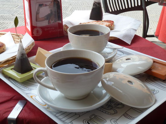 Vorbei an der ältesten Kirche Pisas und an diversen Bauten, bei denen der Denkmalpfleger einen Herzinfarkt bekommen hätte, finden wir auf der Piazza Dante einen ruhigen Platz für einen Snack. Einfachste Pizzastücke und zwei Tee - 8€ - in pyramidenförmigen Teeeiern.