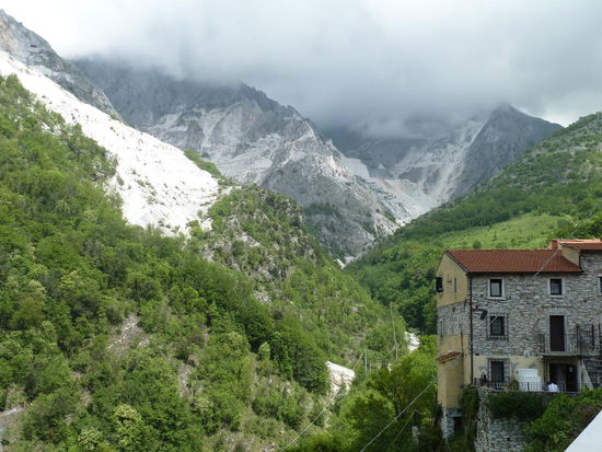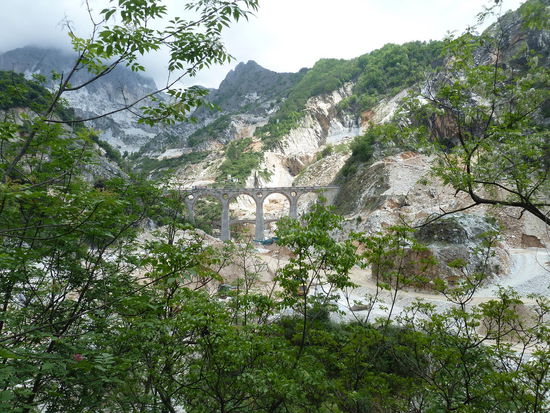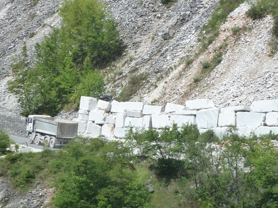 Ein Blick hinunter in einen der Steinbrüche offenbart ein ungewöhnliches Bild: Der Abbau des Marmors hat sein eigenes Tal geschaffen, dessen Seiten in riesigen Stufen zum Talgrund führen. Massive Lastkraftwagen wirken wie Spielzeuge, wenn sie tief unten über den glatten Marmorboden fahren.