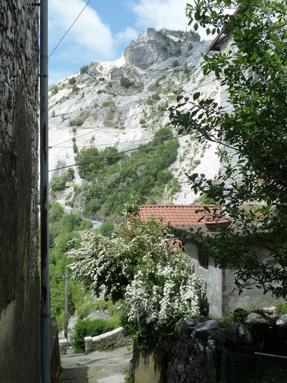 Wir wählen eine kleine Straße durch das Tal (s.Bild oben) dorthin und sehen schon bald die 'zerschundene' Landschaft der Täler von Colonnata, Frantiscritti und Ravaccione, in denen ca 300 Steinbrüche verteilt liegen.