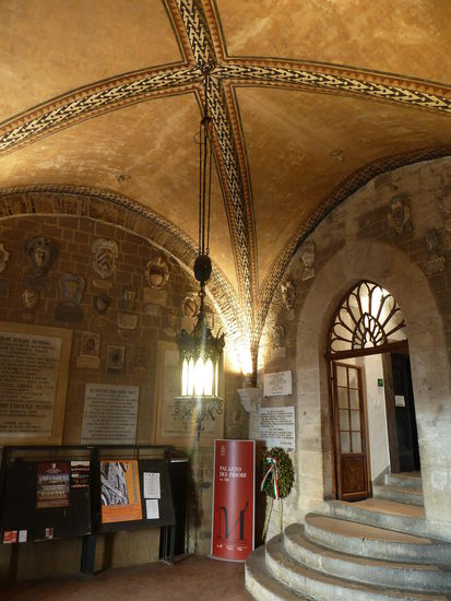 Der 1208-54 entstandene zinnengekönte Palazzo die Priori an der Westseite ist das älteste Rathaus der Toskana. Mit seinem festungsartigen Äußeren - die mit wenigen Fenstern geschmückte Fassade wird von Zinnen und einem Turm bekrönt - war er Vorbild für andere toskantsche Rathäuser.