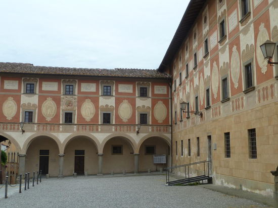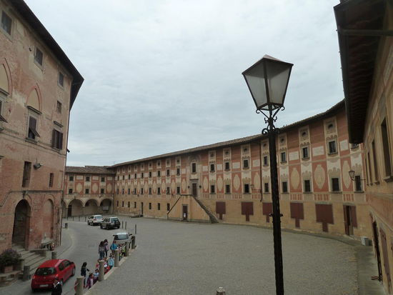 Wir parken an einem zentralen Platz, löhnen mal wieder 1€ Parkgebühr/h und laufen den Hügel weiter hoch. Zunächst treffen wir auf einen weiteren Platz mit einem langgestreckten Diözesan-Gebäude mit Sgraffito-Malereien.