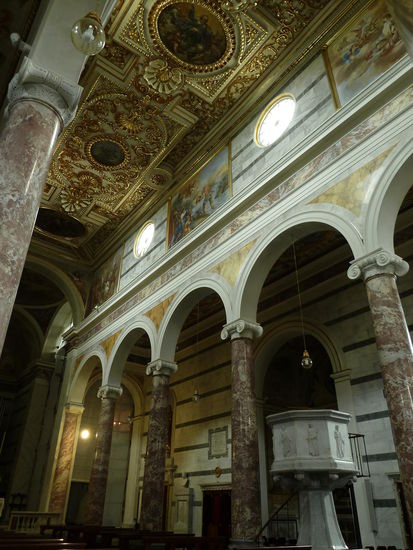 Über steile Treppen kann man dann zum Domplatz hochlaufen., der von außen schlicht und einfach ist, innen aber eindrucksvolle Marmor(?)säulen und tolle Decken hat. Leider ist der Turm mal wieder eingerüstet.