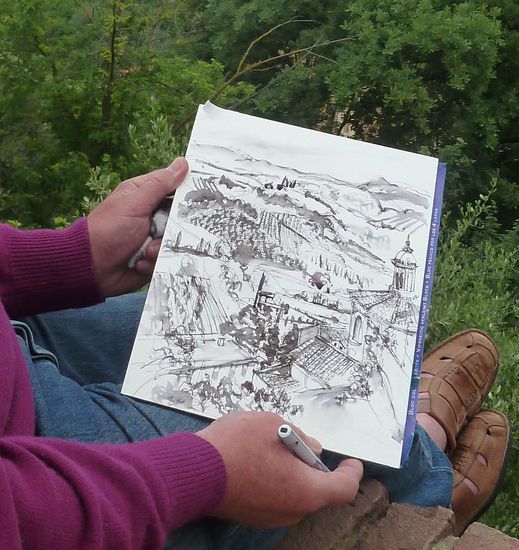 Danach müssen wir zwecks der besseren Aussicht noch zum Rocca Federiciana. Oben ist ein Plateau von dem man ein guten Rundblick hat. Zwei ältere Herren sind beim Skizzieren, wir sprechen sie an und unterhalten uns nett mit den Engländern, die ihre Frauen wohl unten an der Bar des Hotels sitzen haben. Der 'professional' malt mit Wasserfarbe, der zweite - sein Schüler, wie er sagt - in Bleistift. Als ich ihn darauf anspreche, dass er das Gerüst gar nicht mitmalt, meint er: "it wasn't there when I started".